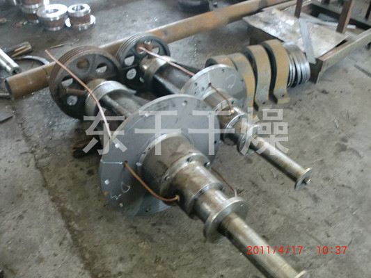 熱空氣切線進(jìn)入干燥器底部,在攪拌器帶動(dòng)下形成強(qiáng)有力的旋轉(zhuǎn)風(fēng)場。膏狀物料由螺旋加料器進(jìn)入干燥器內(nèi),在高速旋轉(zhuǎn)攪拌槳的強(qiáng)烈作用下,物料受撞擊、磨擦及剪切力的作用下得到分散,塊狀物料迅速粉碎,與熱空氣充分接觸、受熱、干燥。脫水后的干物料隨熱氣流上升,分級(jí)環(huán)將大顆粒截留,小顆粒從環(huán)中心排出干燥器外,由旋風(fēng)分離器和除塵器回收,未干透或大塊物料受離心力作用甩向器壁,重新落到底部被粉碎干燥。